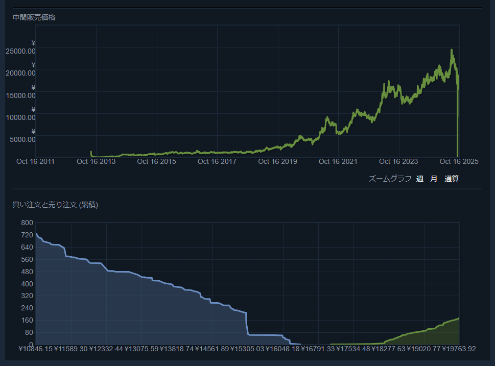 私が手に入れた2023年10月の価格は15000円ほどで、もろもろの手数料を差し引いた結果、売却益として13000円分のSteamウォレットを手にしたわけです。