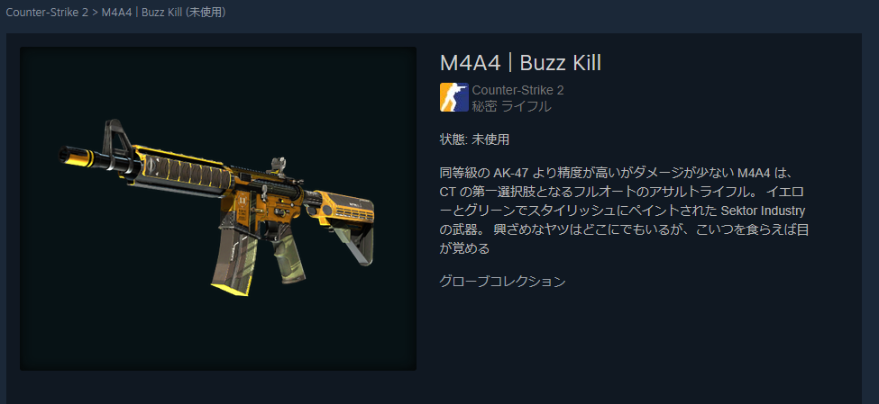 M4A1のスキン「Buzz Kill」の未使用(FN)です。当時約8000円で買ったこのスキン。2025年10月13日現在の価格はこちら。