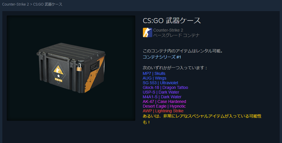 出てきた黒い箱の正体はこれです。名をCS:GO 武器ケース(CS:GO Weapon Case)といい、このケース自体は元々CSGOがリリースされてから最初のケースだったようです。そんな古くからあるケースがプレイしていた2023年ごろにぽろっと出たわけですね。