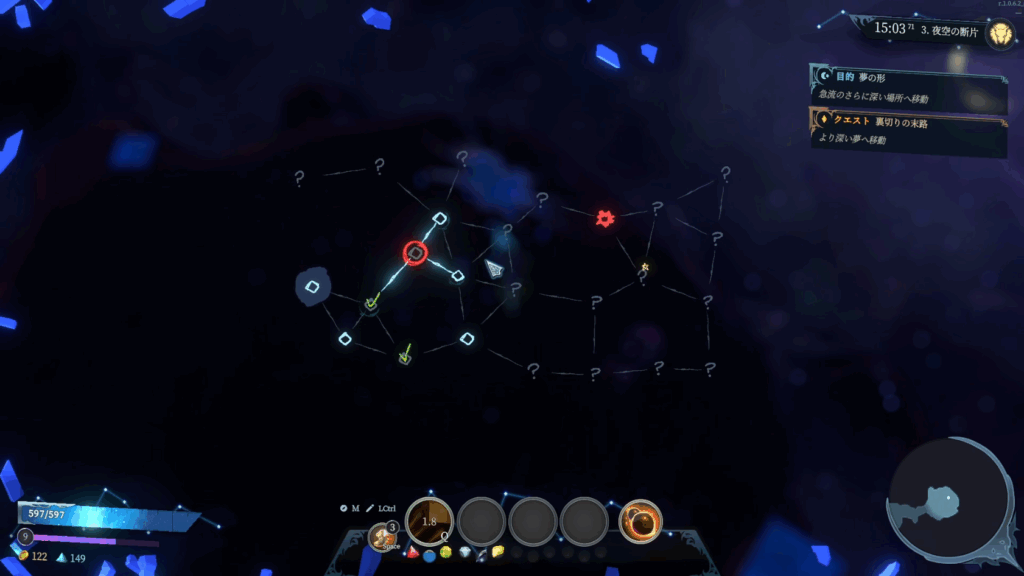 プレイヤーは“夢”と呼ばれるマップを探索していきます。マップは毎回ランダムに生成され、網目状に配置された点を選んで移動していく形式です。進めるのは、現在いる地点に隣接した場所だけ。その際、隣接する点がどんな場所かは事前に確認できますが、それ以外の遠くの点は実際に進んでみるまで分かりません。