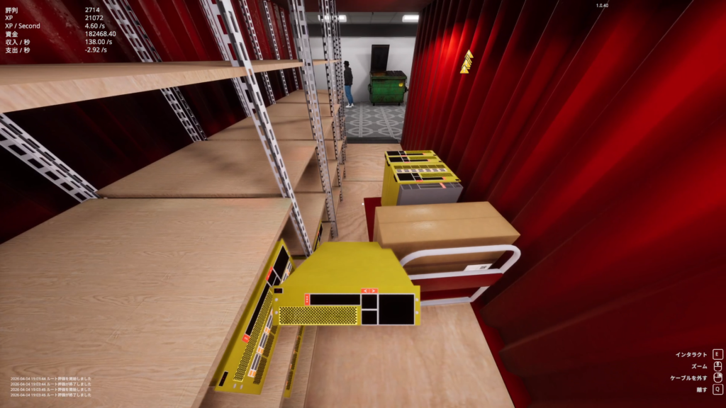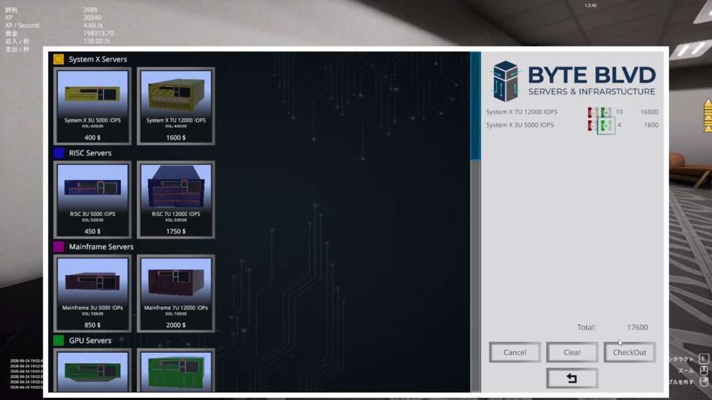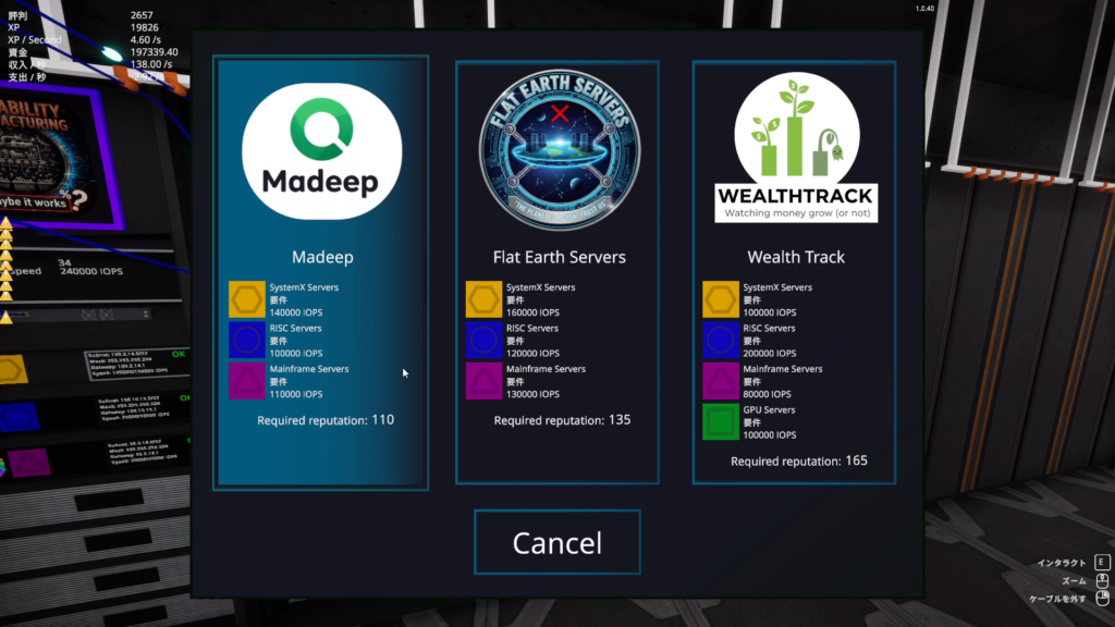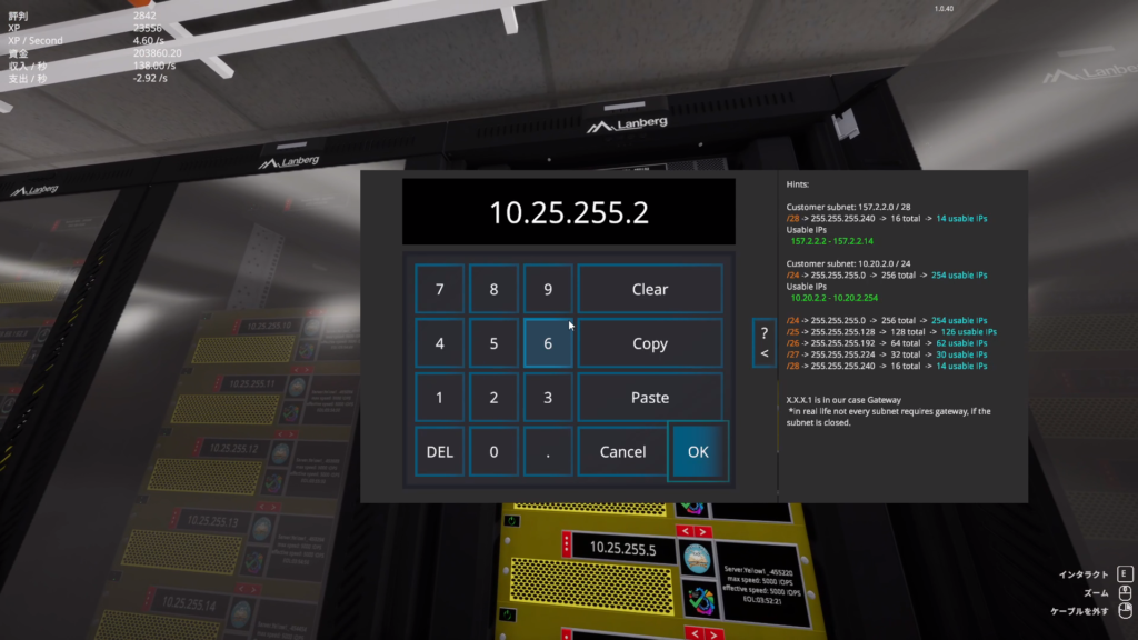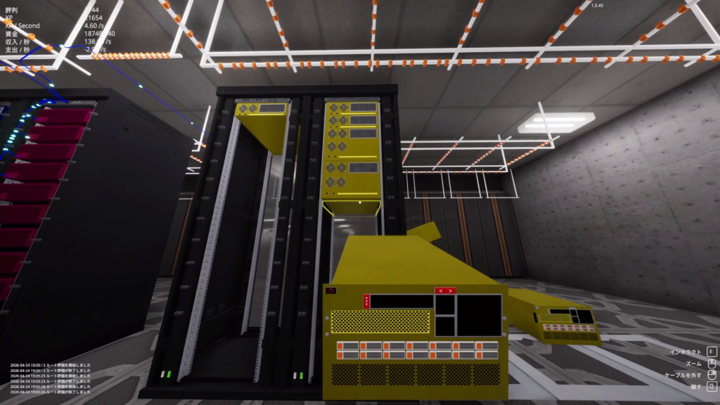 また、ゲームが進行するにつれて構築が難しくなったりするといったことはほぼなく、搬入→サーバー導入→配線→IP割り当てをひたすら繰り返していくだけです。単に構築する量だけが増えて面倒くさくなっていきます。ゲーム的に進行してもやること一緒で難易度も上がらず飽きていく一方でした。