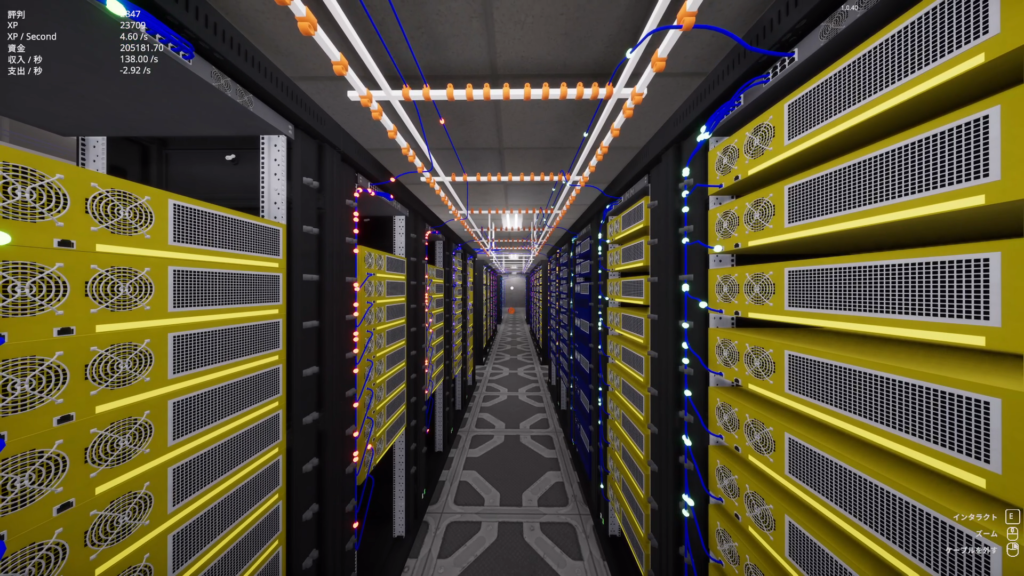 収益を得て、さらに増築を繰り返していった末にできたデータセンターのデータの流れの粒子を見ると、うれしい気持ちになります。光の粒子でデータの流れを視覚的にわかりやすくしたのはゲームとしてはよかったと思います。