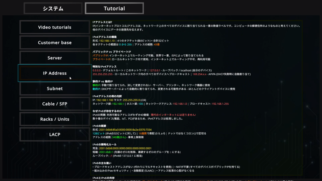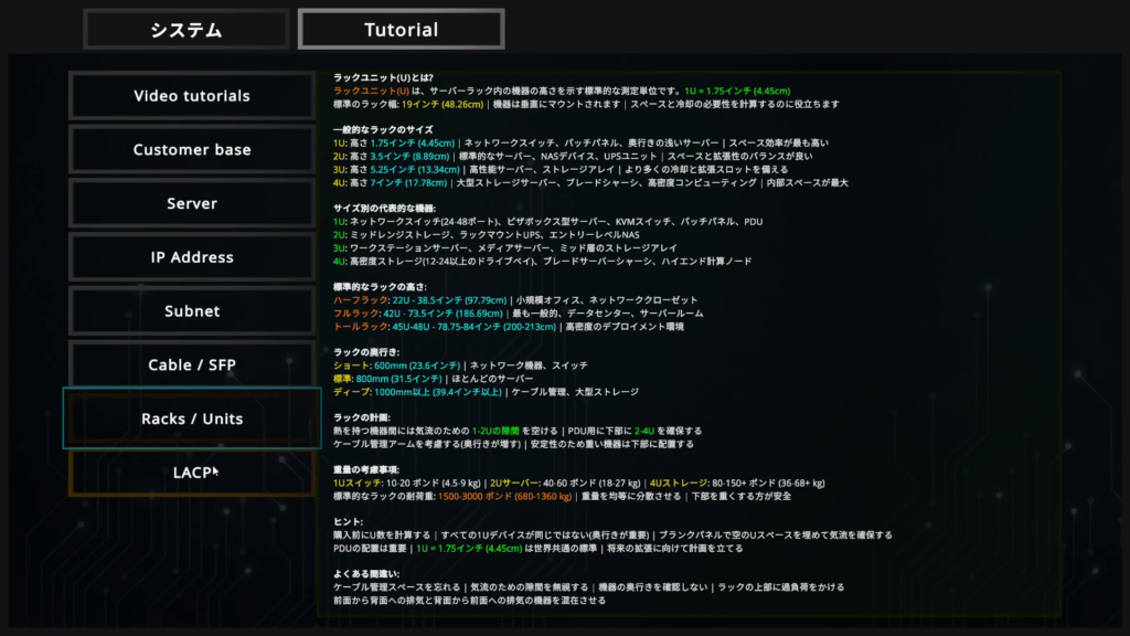 ゲーム開始時からチュートリアルが用意されており、一応サーバーの搬入から構築まではできます。しかし、それぞれの装置や用語の説明がほどんどありません。チュートリアルという項目の中に説明らしきものは載っていますが、知識の話だけでじゃあ実際何をどうすればいいのかというところまで説明がないので、この説明だけではどうしようもありませんでした。参考までにチュートリアルの画面を載せておきます。